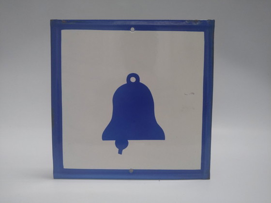 Je kunt hier aanbellen. Vintage emaille bord, blauwe picto op witte achtergrond, blauwe rand. Herkomst: een Bulgaarse houtskoolmijn. Mooi handgemaakt met een licht reliëf. In redelijk goede staat, maar met kleine gebruikssporen.