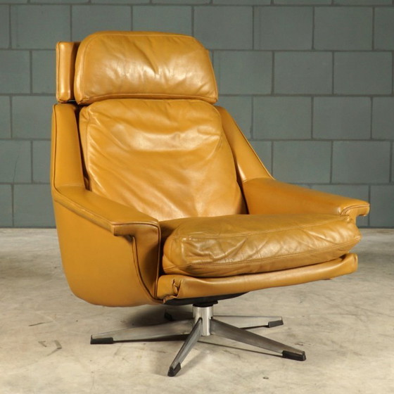 Deze camelkleurige 802 lederen draaifauteuil van ESA is van topkwaliteit. Het leer van de kussens is heerlijk zacht. De armleuningen en de ronde romp van de stoel vertoont, op een paar kleine beschadigingen na (zie foto’s), bijna geen ouderdomssporen. De fauteuil heeft een heerlijke comfortabele zit met een hoofdsteun. De fauteuil werd ontworpen door Werner Langenfeld aan het eind van de jaren zestig. ESA is een Deense meubelfabrikant die in de jaren zestig en zeventig aantrekkelijke en fraai vormgegeven meubelen maakte.