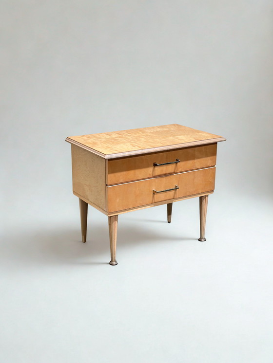 Prachtig origineel mid-century modern nachtkastje uitgevoerd in licht hout met een luxueus blad van gevlamd esdoornfineer. De warme honingkleur en het karakteristieke golvende patroon geven dit meubel een elegante en verfijnde uitstraling.
