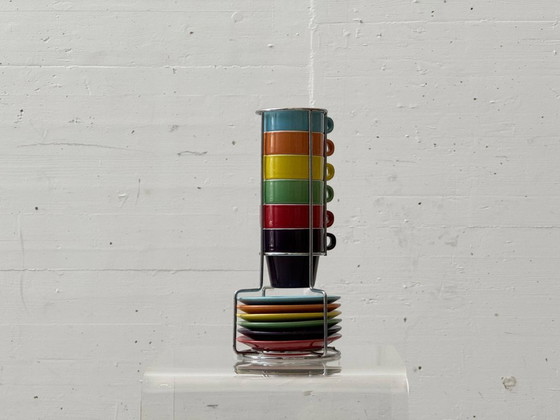 Deze bijzondere espressoset maakt indruk met zijn levendige kleurenschema en functionele, ruimtebesparende opbergruimte in de verchroomde metalen standaard. De zes kopjes met bijpassende schotels zijn uitgevoerd in gedurfde, op elkaar afgestemde kleuren – van turquoise, oranje, geel en groen tot rood en violet – en vormen, wanneer ze op elkaar gestapeld worden, een opvallende, grafische eenheid.