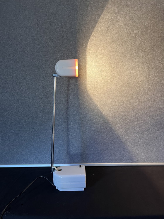 Fagerhults Eichhoff. Deze werkende design-bureaulamp van Fagerhults Belysning (Eichhoff Wercke) is een prachtig space age ontwerp uit Zweden in de jaren 70. (Productie Hong Kong) Hij is ingeklapt compact, maar met de telescooparm heb je in een handomdraai een fraaie bureaulamp. De behuizing is van kunststof, de arm van chroom. Met 3 standen schakelaar. In uitstekende vintage staat. Minuscuul klein barstje in de kunststof behuizing, zie foto 13.