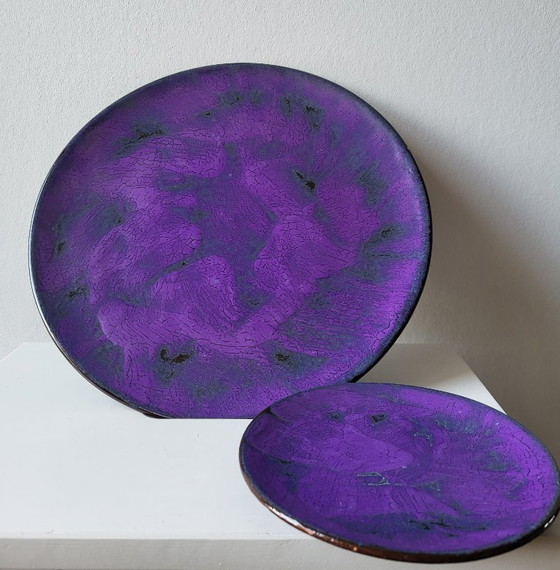 Prachtig elf delig servies. Betreft een serveerschaal en alle tien de gebaksbordjes. Door de dieppaarse kleur is dit een echte eyecatcher op tafel! Vrijwel uniek. Alleen de serveerschaal heeft een grotere chip. De gebaksbordjes zijn in zeer goede conditie gezien de leeftijd. Bevatten geen grote schade.