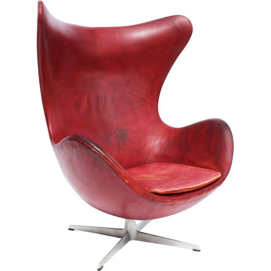 De Egg, model 3316, ontworpen door Arne Jacobsen in 1958 en geproduceerd door Fritz Hansen in 1963. De stoel heeft een originele gepatineerde bekleding met elegant rood leer en is in zeer goede vintage staat. De Egg heeft een draaifunctie.