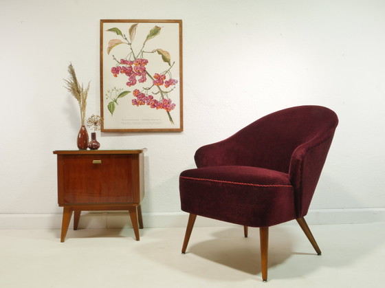 Deze fauteuil is een origineel exemplaar uit de jaren 60. De zitting is gemaakt van beuken- en vurenhout en bekleed met wijnrode structuurstof met een zwart patroon. Rode en zwarte biezen ronden het ontwerp af.