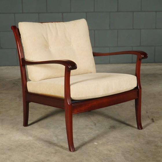 Deze prachtige mahoniehouten fauteuil komt uit Duitsland en dateert uit de jaren 60/70. De ontwerper of fabrikant zijn helaas onbekend, maar het kan niet anders dan dat er een goede ontwerper achter zit! Wat een prachtig design en wat een kwaliteit! De fauteuil heeft een zeer elegante klassieke uitstraling, waarbij het frame is gemaakt van mahoniehout en de kussens zijn bekleed met een mooie kwalitatieve stof in een crème/beige tint. Niet alleen heel fraai, maar ook nog eens super praktisch aangezien alle kussens los en afritsbaar zijn. De fauteuil biedt een zeer prettig zitcomfort. Een ware eye-catcher! De fauteuil is in uitmuntende staat, met zeer geringe gebruikssporen op het hout of bekleding. Bijbehorende driezitsbank is ook te koop.