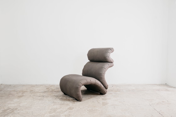 Designfauteuil met golvende structuur. Originele fauteuil uit de jaren 70 en 80, recent opnieuw bekleed met een hoogwaardige, moderne stof die het sculpturale silhouet accentueert.