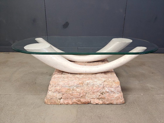Opvallende vintage faux slagtand salontafel gemaakt van gevlochten steen met een afgeschuind helder ovalen glazen blad.
