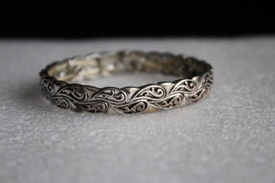 Elegante armband in vintage-stijl met een antiek design, zilverkleurig en elastisch. Perfect om een vleugje nostalgie aan je sieradencollectie toe te voegen.