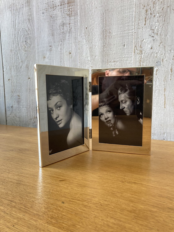 Prachtig jaren 70 fotolijstje van zilverkleurig metaal en zwart vilt. Het kan op een meubel worden geplaatst of aan de muur worden gehangen. De "sporen" die te zien zijn op de foto's zijn in feite lichte reflecties, en het is in zeer goede staat. Afmetingen: hoogte 17cm, breedte 25cm open of 12,5cm dicht, dikte 1cm.