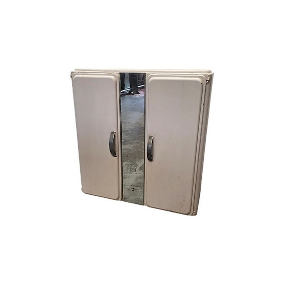 Vintage Frans metalen medicijnkastje, afkomstig uit de jaren 40/50. Leuk model medicijnkastje met 2 deuren en in het midden een spiegel. Gemaakt in Frankrijk en is volledig van metaal en in het verleden een keer wit geschilderd. De spiegel heeft wat weer en rondom wat gebruikerssporen.