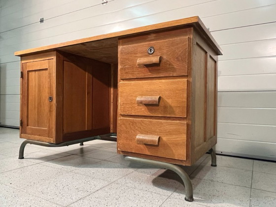 Dit is een vintage Frans schoolbureau voor een leerkracht of surveillant (bureau de maïtre, bureau d'instituteur). Het straalt de typische na-oorlogse stijl uit van de jaren '50 van de vorige eeuw en doet denken aan de ontwerpen van Jean Prouvé, Jacques Hitier, Marcel Gascoin, Robert Charroyu e.a. De constructie is oerdegelijk en robuust met een corpus in massief en fineer eiken dat rust op een stoer metalen frame. Het meubel is goed bewaard en nog heel fraai voor zijn respectabele leeftijd met weliswaar duidelijke gebruikssporen maar geen echte schade. Aan de ene zijde een deurtje, dat toegang geeft tot een opbergruimte. Aan de andere zijde 3 lades met leuke massieve handgrepen. In principe zouden die op slot moeten kunnen maar het sleuteltje is er helaas niet meer. Het meubel is volledig authentiek... geen restauraties, geen opsmuk maar helemaal "au naturel".
