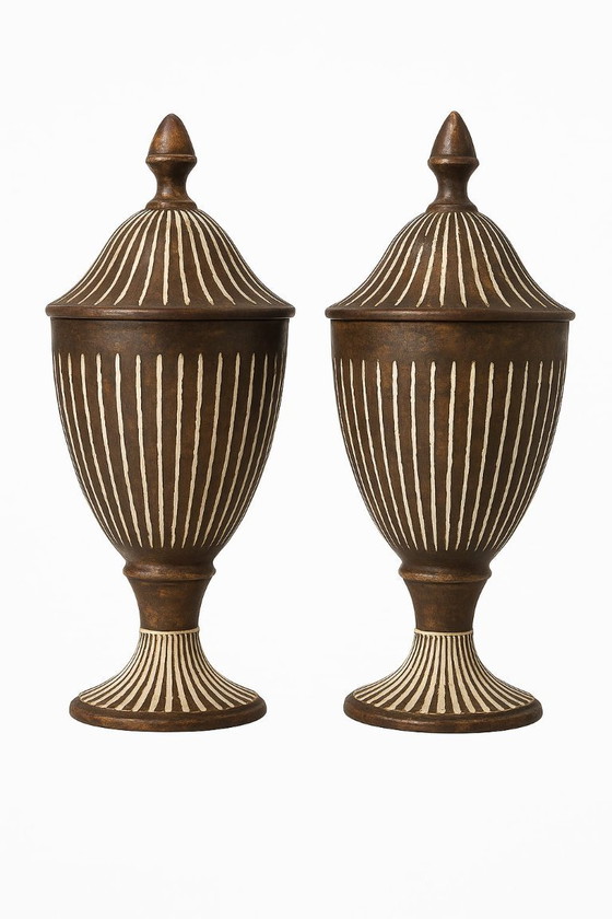 Deze urnen zijn in goede vintage staat, met ouderdomssporen aan zowel de binnen- als buitenkant, wat hun authentieke, rustieke charme versterkt. De ambachtelijke uitstraling is prachtig met een charmante, verouderde patina.