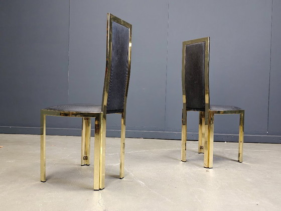 Set of six elegant dining room chairs with shiny golden frames and a textured vinyl upholstery;