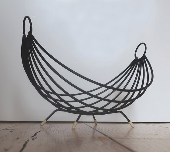 Vintage fruitschaal of mandje van zwart draadmetaal en witte kunststof voetjes. De fruitschaal komt uit de vijftiger jaren en is sierlijk van vorm. De conditie is goed gezien de leeftijd. De afmetingen zijn 26 cm lang, 20 cm breed en 17,5 cm hoog.