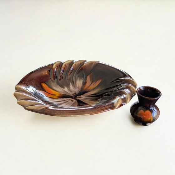 Deze prachtige vintage fruitschaal met bijpassende kleine vaas is een echte blikvanger voor elk huis. Gemaakt van keramiek en met een glanzend glazuur in warme bruine, oranje en beige tinten, straalt de set een charmant retro karakter uit.
