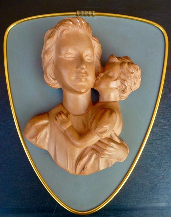 Dit kunstwerk toont een intiem moment van een moeder en kind, subtiel vormgegeven in een zachte, aardse tint in keramiek en omlijst door een elegante gouden rand.