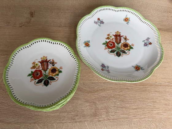 Vintage gebaksset met opengewerkte rand en bloemmotief. Porselein, puntgaaf en vooral.... heel feestelijk!