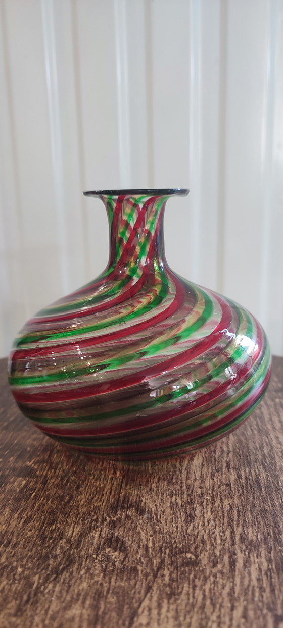 Geblazen glazen vaas, gebogen vorm, versierd met rode, groene en transparante spiralen.