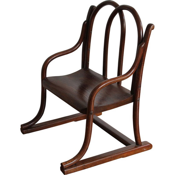 Een authentieke kinderstoel van gebogen hout uit het begin van de 20e eeuw. Oorspronkelijk was deze stoel als één geheel verbonden met een klein bureau. Thonet produceerde dit type kindermeubilair al vanaf het einde van de 19e eeuw. Er waren verschillende ontwerpen, maar ze verschilden vooral in de stijl van de rugleuning. We vinden dit exemplaar voor het eerst gepubliceerd in de Thonet-catalogus uit 1885.