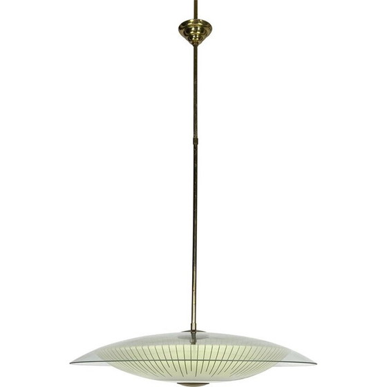 Deze kroonluchter van glas en messing herinnert aan de Fontana Arte-stijl en werd in de jaren 1950 in Italië gemaakt. Originele vintage staat met normale ouderdoms- en gebruikssporen. Glas zonder barsten of chips. Werkt volledig met Europese standaard, op verzoek aan te passen voor Amerikaanse standaard.