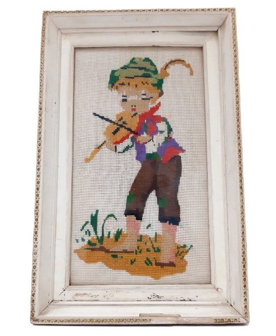 Dit prachtige vintage geborduurde gobelin wandkleed legt de charme vast van een jonge violist in een betoverende scène. Elegant ingelijst onder glas getuigt dit stuk van het kunstenaarschap en vakmanschap van vervlogen tijden en biedt een nostalgische blik in het verleden.