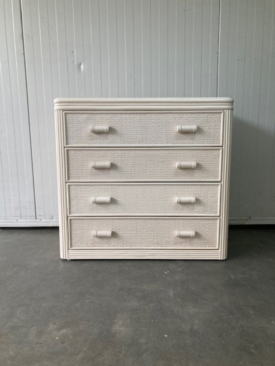 Ladekast van rotan en bamboe in gebroken wit, jaren 1980. Geweven rotan, hout en handgrepen van bamboe. 5 lades met gevormde bamboe handgreep.