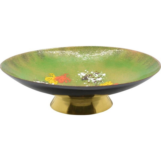 Een grote koperen kom of schotel werd rond de jaren 1950 en 1960 in Duitsland gemaakt. De schaal is bedekt met handgedecoreerd email. Een klassiek decoratief object, kenmerkend voor Oost-Duitsland uit het midden van de 20e eeuw. Het object is in zeer goede staat, heeft kleine krassen op het emaille oppervlak. Onderstel van messing.