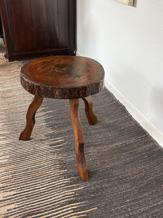 Vintage gelakt houten tripod krukje. Made in France. Gelakte grove textuur aanwezig. Geschulpte poten. Handgemaakt item dus er kunnen imperfecties aan zitten maar dat maakt het juist zo karakteristiek & uniek vind ik. Verkeert in een hele goede staat. Uniek one of a kind item.