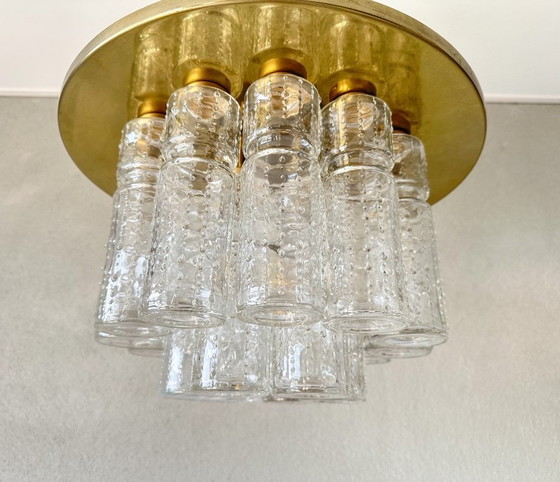 Mooi mid century design. Jaren 70 plafondlamp gemaakt door het Duitse Glashütte Limburg. Messing ronde basis met 18 gesculpteerde glazen cilinders op 2 verschillende hoogtes.