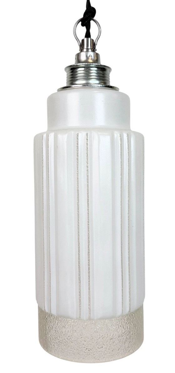 Vintage plafondlamp van melkglas, gemaakt in het voormalige Tsjecho-Slowakije in de jaren 70. De metalen fitting is geschikt voor standaard E27/E26 lampen. Nieuwe textielkabel en een zwarte ijzeren plafondkap. Het gewicht van de lamp is 0,6 kg. De diameter van de lamp is 10 cm. De diameter van de plafondkap is 8 cm.