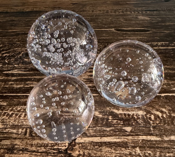 Deze prachtige vintage glazen presse-papiers zijn een schitterend voorbeeld van vakmanschap en elegantie. De luchtbellen, ook wel bekend als bullicante, geven een unieke en fascinerende uitstraling die elke ruimte kan verfraaien.