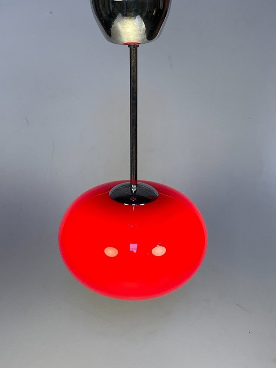 Een zeer stijlvolle rode hanglamp met chromen armatuur gemaakt in de 1980's. De glazen ovalen kap waarvan de binnenzijde wit is, geeft een mooi warm licht. De kap is bevestigd aan een chromen armatuur met stang en plafondkap. In nette conditie zonder noemenswaardige gebruikssporen.