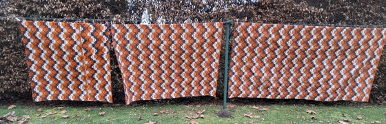 Ga terug in de tijd met deze prachtige vintage gordijnen uit de jaren 60 en 70, een perfecte belichaming van de gedurfde designfilosofie van die tijd. De levendige oranje en bruine geometrische patronen steken af tegen een helderwitte achtergrond en creëren een opvallende visuele aantrekkingskracht die de inrichting van elke kamer zal verfraaien.