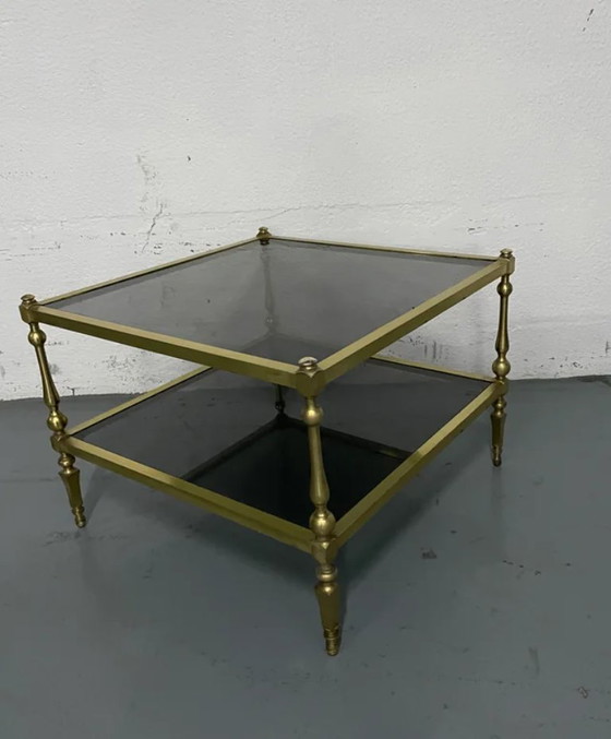 Elegante vintage Franse salontafel in Hollywood Regency-stijl. Gemaakt van gerookt glas en goud/bronskleurig metaal. In goede staat. Glamoureus, veelzijdig en praktisch voor elke kamer.