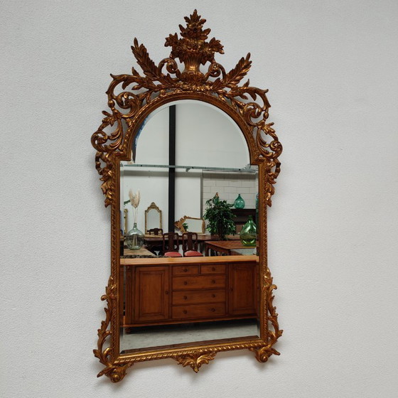 Zeer mooie elegante goudkleurige brocante facet geslepen kuifspiegel. Mooi voor in de hal, boven de kaptafel of gewoon in de woonkamer. Super leuk in een Hollywood Regency interieur. De spiegel is in goede vintage conditie en kan hier en daar wat gebruikssporen of verweerde plekjes in de spiegel hebben.