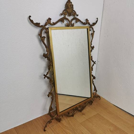 Zeer mooie elegante messing brocante kuifspiegel. Mooi voor in de hal, boven de kaptafel of gewoon in de woonkamer. Super leuk in een Hollywood Regency interieur. De spiegel is in goede vintage conditie.