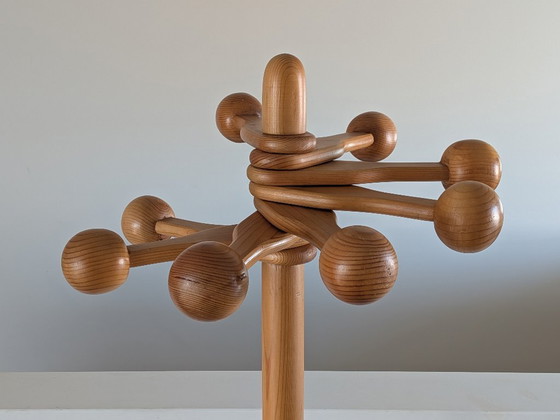 Een klassieker van het Scandinavische functionalisme uit de jaren 70. Deze vrijstaande kapstok, vaak aangeduid als het "Sputnik" of "Saturn" model, is volledig vervaardigd uit massief grenenhout. Hij heeft een draaibare kop met acht bolvormige haken, wat een speelse maar architectonische manier biedt om je hal te organiseren.