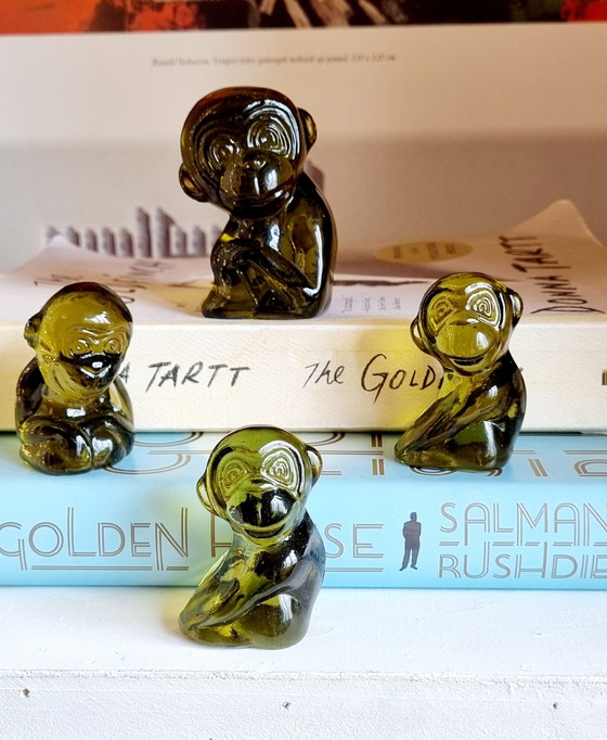 Vintage, Fostoria glas bedrijf, groen glazen aap set van 4. Moeder aap en haar 3 baby's.