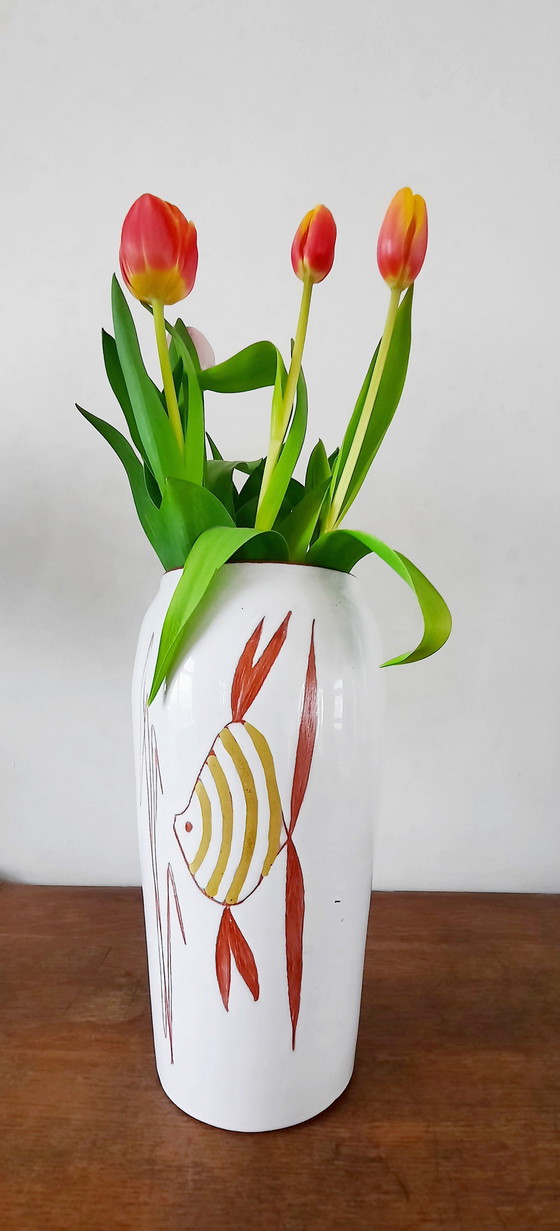 Decoratieve vaas uit het midden van de vorige eeuw (1958-1960) gemaakt door Gubbels. Typerend 50/60 jaren ontwerp van de aardewerkfabriek Gubbels in Tegelen. Het bedrijf stond bekend om zijn handgemaakte keramische objecten, zoals vazen, schalen en lampvoeten en was actief in de 20e eeuw. Gubbels aardewerk is tegenwoordig populair bij verzamelaars van vintage keramiek. Aan de onderzijde voorzien van het signatuur en ontwerper (DH = Dries Holten). Tijdens deze samenwerking zijn er ook vazen gemaakt met diverse decoraties. In dit geval vissen. Deze zijn gewoonlijk niet gemerkt. In glanzend wit, matbruin en matgeel maanvisdecor.