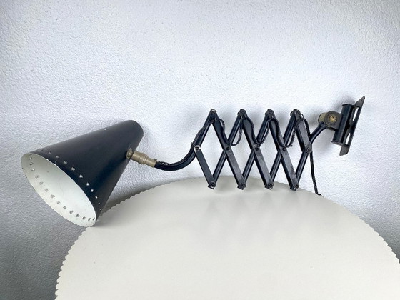Deze accordeonlamp heeft een conische zwart metalen lampenkap met stervormige perforaties langs de rand. De lampenkap heeft een diameter van 12,4 cm (4.9") en de arm kan worden uitgeschoven tot maximaal 71 cm (28") lang. Schakelaar aan het snoer. Origineel merklabel intact!