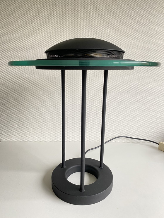 Vintage halogeen jaren ‘80 lamp. Deze lamp is 47 cm hoog en 40 cm breed en heeft een dimmer. Bovenop de kap en op de voet een kleine beschadiging (zie foto’s), vandaar de vraagprijs.