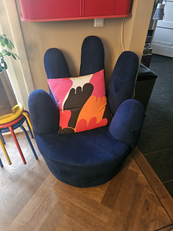 Deze geweldige vintage draaibare handstoel is een echte eyecatcher! De stoel is bekleed met een zachte, blauwe stof en heeft de vorm van een hand. Perfect voor een speelse en unieke touch in je interieur. De stoel is tientallen jaren oud, maar in goede staat. Een paar kleine gaatjes die door een handig iemand makkelijk herstelt kunnen worden.