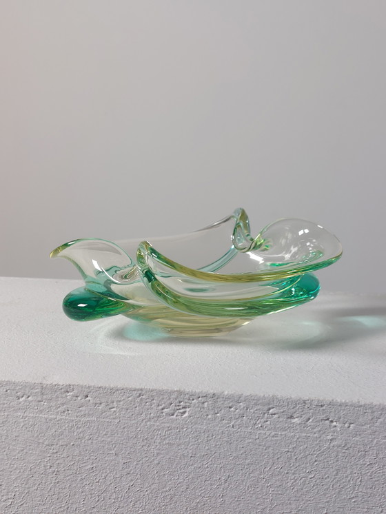 Deze prachtige vintage schaal uit het midden van de vorige eeuw, vervaardigd uit handgemaakt kunstglas, is een waar meesterwerk van glasblaaskunst. De vloeiende lijnen en harmonieuze combinatie van helder en groen glas geven dit stuk een elegante en tijdloze uitstraling.
