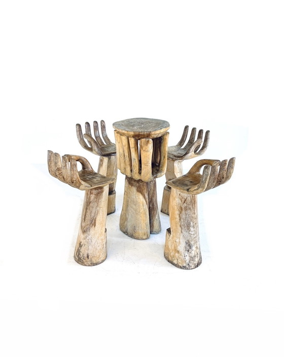 Vintage handgesneden barkrukken + tafel in de vorm van een hand, Indonesië jaren ‘70.