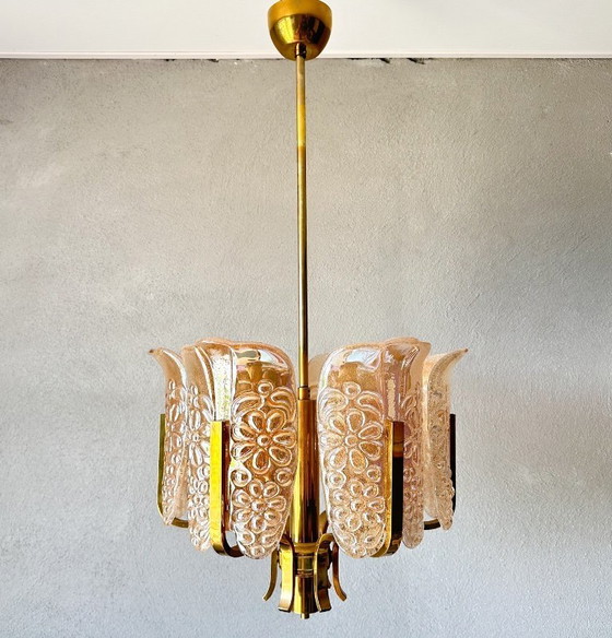 Mooi mid century design. Jaren 70 kroonluchter gemaakt door heg Duitse JBS, staat voor Josef Brumberg Sundern. Messing basis met 8 smoked pink glazen bladeren met gesculpteerd motief. In een zeer goede vintage conditie.