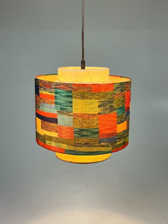 Een erg leuke en vrolijke hanglamp, gemaakt in Duitsland in de 1970's. Het betreft een lamp met een uit meerdere lagen bestaande kap, de buitenste is in een blokkenmotief in diverse kleuren gedecoreerd waardoor het geheel een mooi warm licht geeft. Nog in nette conditie met slechts wat lichte gebruikssporen.