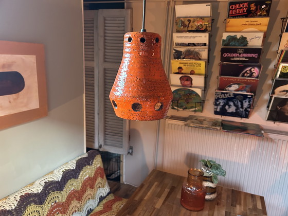 Verlicht uw ruimte met een vleugje retro-elegantie met deze vintage hanglamp uit West-Duitsland met Fat Lava-glazuur. De levendige oranje kleur en kenmerkende textuur roepen de iconische designesthetiek van het midden van de 20e eeuw op, waardoor het een perfecte blikvanger is voor elke kamer.