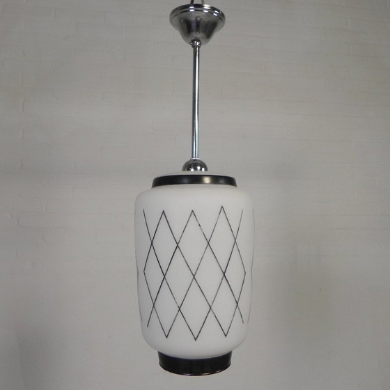 Vintage hanglamp met opaline kap met zwarte decoratie, jaren 50