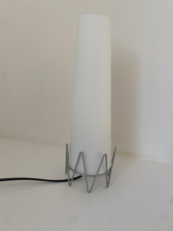 Zie ook mijn overige advertenties. Vintage Hema - Space Age tafellamp - Jaren ‘80 Deze moderne tafellamp bestaat uit een witte, kegelvormige kap van matglas die rust in een zilverkleurige metalen houder. Hoogte 34 cm