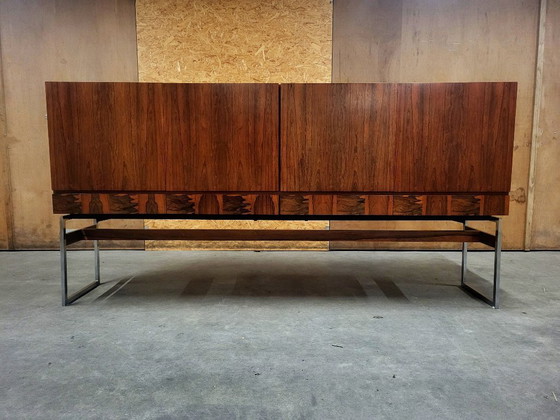 Grote stijlvolle highboard, model 600, uitgevoerd in palissander en chroom van Aurora Meubelfabriek, België 1960. Het ontwerp is strak en modern. Door zijn licht chromen onderstel lijkt de kast lost te komen van de grond, Mooie details is hoe het fineer is aangebracht op de vier lades en kast deuren. Met vier lades en twee kastdelen biedt dit meubel veel opbergruimte. De kast verkeert in nette vintage conditie. Met sporen van gebruik conform leeftijd. De achterwand is vervangen.